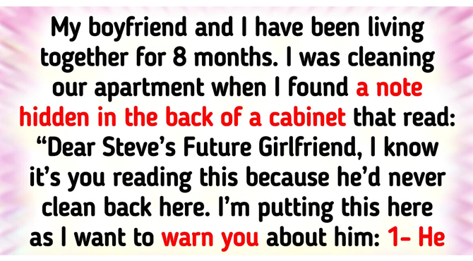 “My boyfriend Steve (30m) and I (28f) have been together for 2 years and have been living together for 8 months. I was cleaning our apartment when I found a note in the back of a cabinet that read: