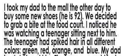 Last weekend, I took my 92-year-old dad to the mall to get him a new pair of shoes. After shopping, we stopped at the food court for a meal and found a seat beside a teenager with brightly colored spiked hair. The vibrant mix of green, red, orange, and blue instantly caught my dad’s attention. He looked at the boy curiously, not with judgment, but with quiet interest. I noticed the teen glancing back, unsure of why my dad kept observing him.