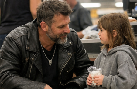 The supermarket went strangely quiet as a man in a black leather jacket stepped forward from another checkout line. He was tall, broad-shouldered, his jacket worn and creased like it had seen a thousand miles of road. A silver chain hung at his neck. His beard was streaked with gray, and his boots thudded softly against the tile as he walked closer.