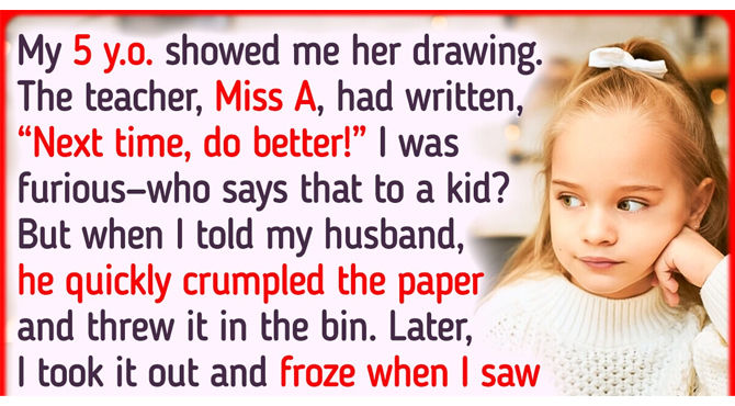 My 5 y.o. showed me her drawing. The teacher, Miss A, had written, “Next time, do better!” I was furious—who says that to a kid? But when I told my husband, he turned pale, quickly crumpled the paper, and threw it in the bin.