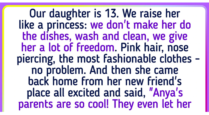 Our daughter is 13. We raise her like a princess: we don’t make her do the dishes, wash and clean, we give her a lot of freedom. Pink hair, nose piercing, the most fashionable clothes — no problem. And then she came back home from her new friend’s place all excited and said, “Anya’s parents are so cool! They even let her cook soup!”