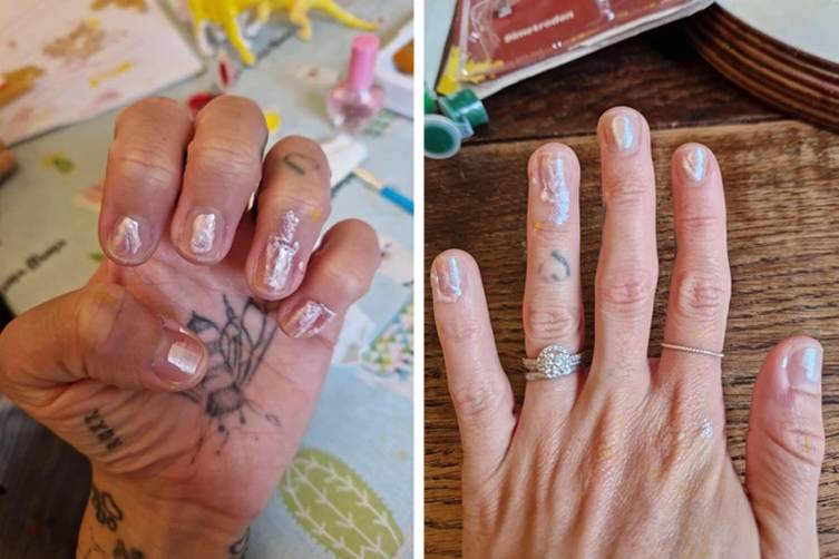 “Would you pay 3 chocolate coins and 1 cookie for these nails? Courtesy of my 2.5-year-old daughter.”