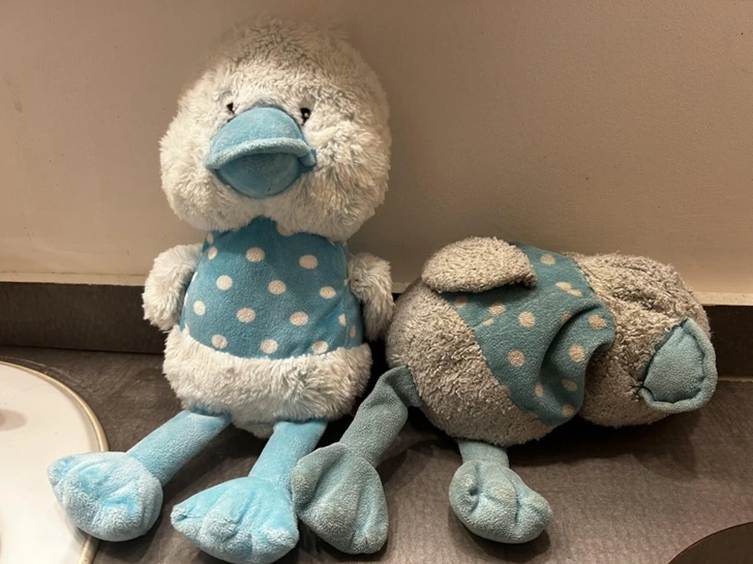 “Life before and after kids. As demonstrated by my toddler’s well-loved Ducky and new backup Ducky”