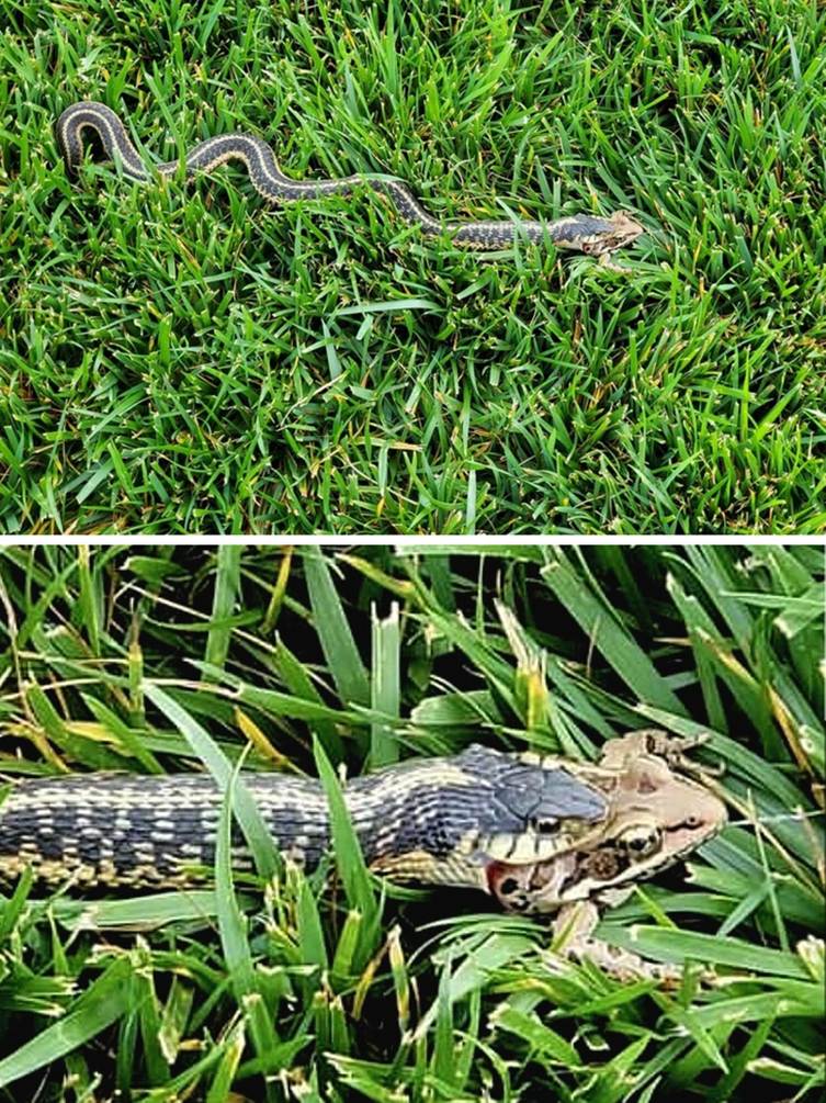 “The legs were that of a half-eaten frog. He then rescued the little frog and carried the snake back into a field. Fun day.”