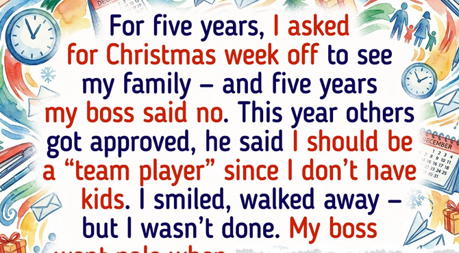 For the past five Christmases, I’ve asked for the same simple thing: one week off to go home and see my family. And for five straight years, my boss shut me down without hesitation. The explanation always changed — one year we were “too busy,” another year we were “understaffed,” then it was “not a priority right now.” Different words, same answer: no.