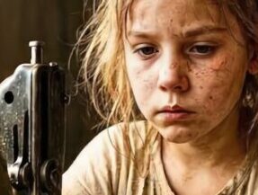 Inside, sunlight leaked through a cracked window and landed on a wooden table. At it sat a little girl—no more than nine or ten—hunched over an old sewing machine. Her hair was tangled, her cheeks smudged with grime. A strip of cloth was wrapped around her wrist like a makeshift bandage. The machine rattled with each press of her foot, loud in the quiet room.
