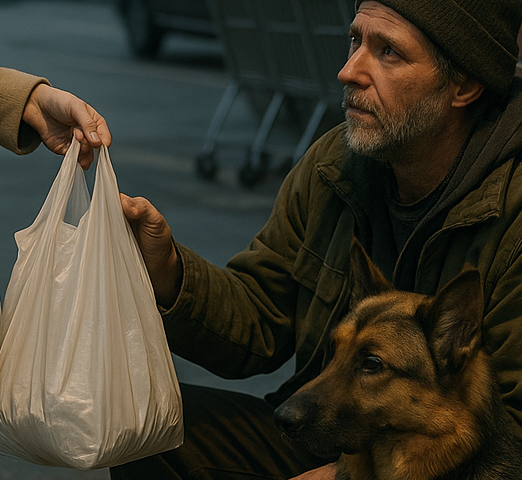 I hurried back inside and bought a hot meal — chicken, potatoes, vegetables — plus dog food and bottled water. The cashier gave me a small, knowing smile. “Someone out there will be grateful.”