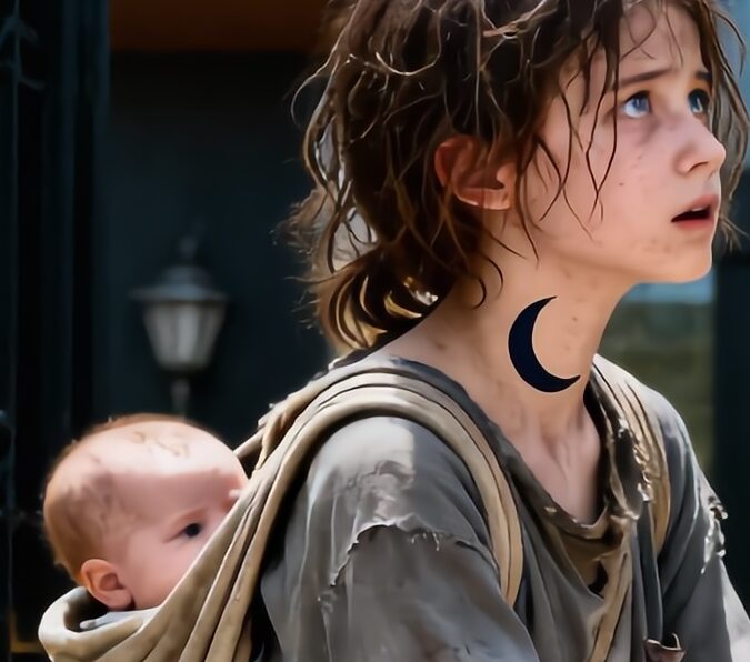 Standing several steps behind him was a teenage girl. She looked no older than eighteen. Her body was fragile, almost shaking inside torn, dirt-stained clothes. Her face was pale, hollowed by hunger and exhaustion. Strapped tightly against her back was a tiny baby, wrapped in a faded, threadbare cloth.