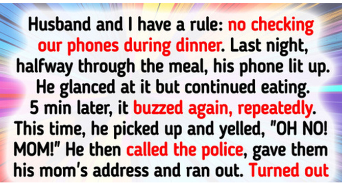 Husband and I have a rule: no checking our phones during dinner. Last night, halfway through the meal, his phone lit up. He glanced at it, but continued eating. Five minutes later, it buzzed again, repeatedly. This time, he picked it up and yelled, “OH NO! MOM!”
