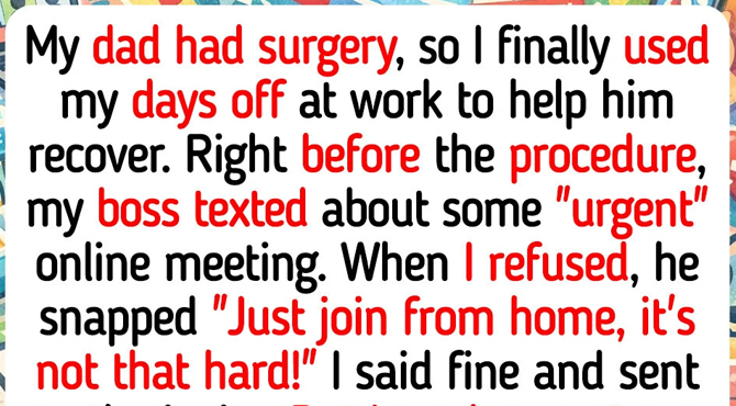 Cue the problem. Right before my dad’s procedure, my boss texts me about an “urgent” online meeting that apparently can’t wait. I reply saying I’m out on approved leave and literally sitting in a hospital, so I can’t join. His response? “Just join from home, it’s not that hard.”