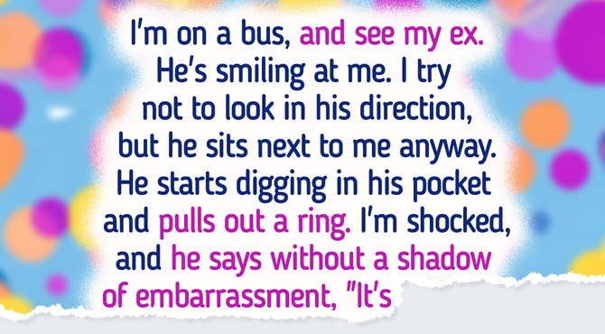 I’m on a bus, and see my ex. He’s smiling at me. I try not to look in his direction, but he sits next to me anyway. He starts digging in his pocket and pulls out a ring.
