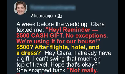 I stared at it, stunned. There had been no previous message. No group chat mention. No note on the invite. Just Clara rewriting the rules a week before her wedding.