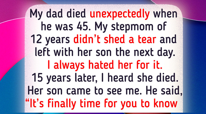 15 years later, I heard she had died. Her son came and demanded to see me. He said, “It’s finally time for you to know what really happened.” He told me my dad had been sick for a while, but they chose not to tell me. I was too young, and my dad didn’t want me to be hurt by the truth.