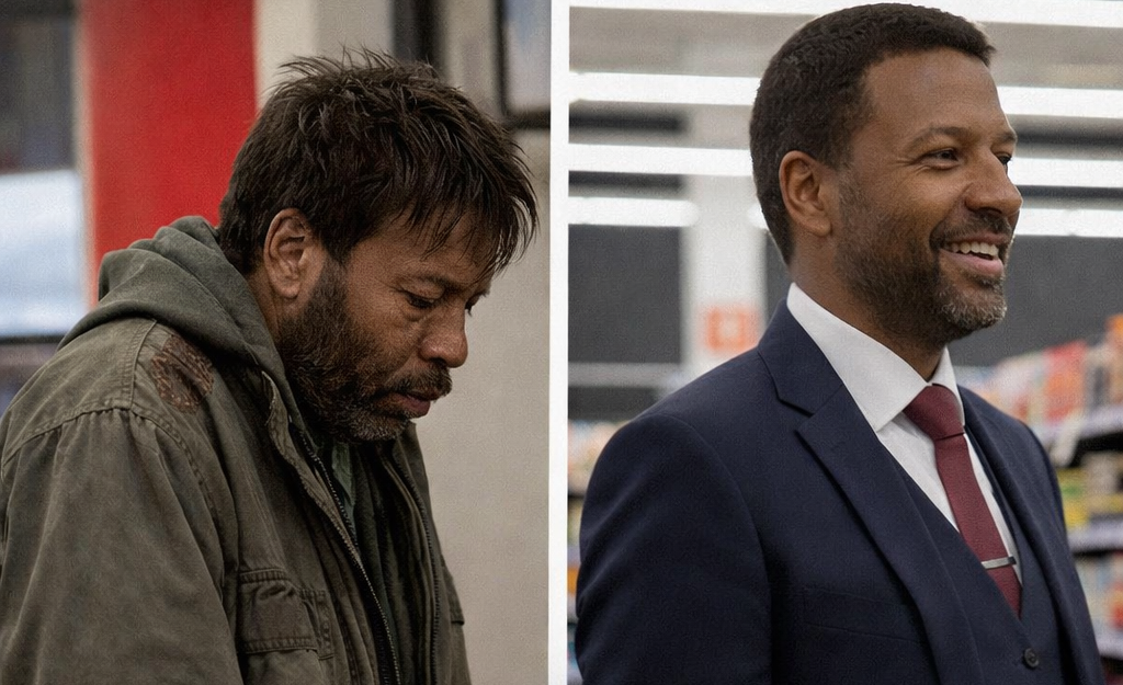 Walking down the staircase was the same veteran from the grocery store. But he looked completely different. Clean-shaven. Groomed hair. Tailored suit.
